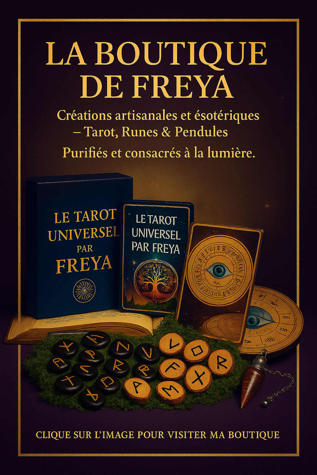 Créatrice du Tarot Universel, j’ai voulu donner vie à un univers magique où chaque objet est porteur d’énergie et de sens.